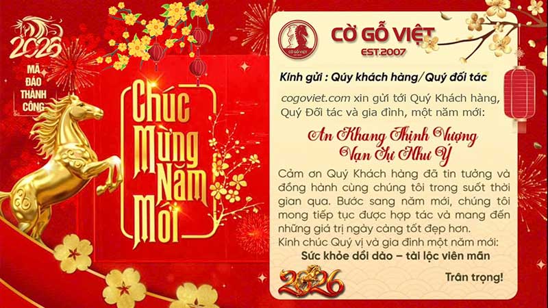 Tin Tức 16/02/2026 9:58:46 PM 11 Cogoviet.com Kính chúc Quý Khách hàng, Quý Đối tác và gia đình một năm mới: Sức Khỏe Dồi Dào - Tài Lộc Viên Mãn - Mã Đáo Thành Công! Tags: Xuân Bính Ngọ 2026Chào xuân Bính Ngọ2026Năm mớiCờ gỗ chúc mừng năm mớiTết nguyên đánChào xuân Tweet Phản hồi bài viết (5 stars) Nhập vào những mục bắt buộc Cảm ơn bạn đã để lại thông tin! Quý khách đã gửi THÀNH CÔNG. Cám ơn Quý khách hàng đã tin tưởng và sử dụng dịch vụ của chúng tôi. Bộ phận chuyên môn sẽ liên hệ lại cho quý khách trong giây lát. Trân trọng!Thông tin đã được gửi đi. Cám ơn bạn đã quan tâm!Thông tin đã được gửi đến ban biên tập. Cám ơn bạn đã quan tâm! Gửi liên hệ